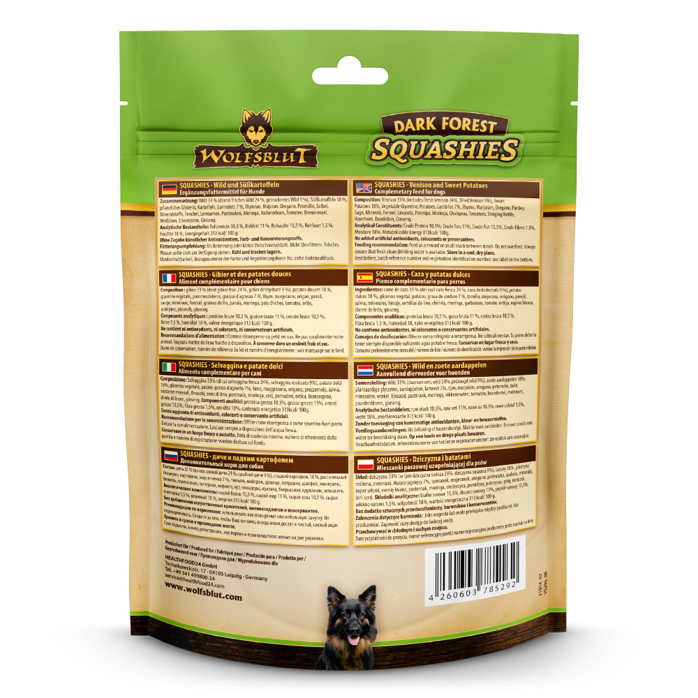 Filozofia marki Wolfsblut opiera się na naturalnej diecie wilka – dlatego przysmaki Squashies łączą wysoką zawartość mięsa z dziczyzny z batatami, zdrowymi tłuszczami oraz naturalnymi dodatkami roślinnymi. Obecność superfoods, takich jak moringa, pokrzywa czy żeń-szeń, czyni z nich przekąskę, która nie tylko smakuje, ale także wspiera zdrowie psa.